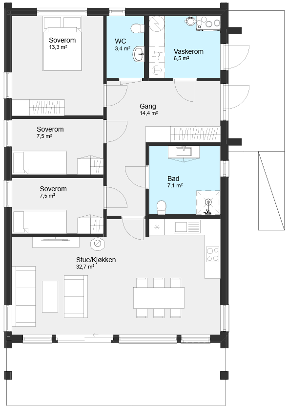 Med en bolig som kombinerer enkel eleganse og praktiske løsninger, blir det enkelt å bo godt på ett plan. Den åpne stue- og kjøkkenløsningen er boligens naturlige samlingspunkt, med god plass til både hverdag og gjester.