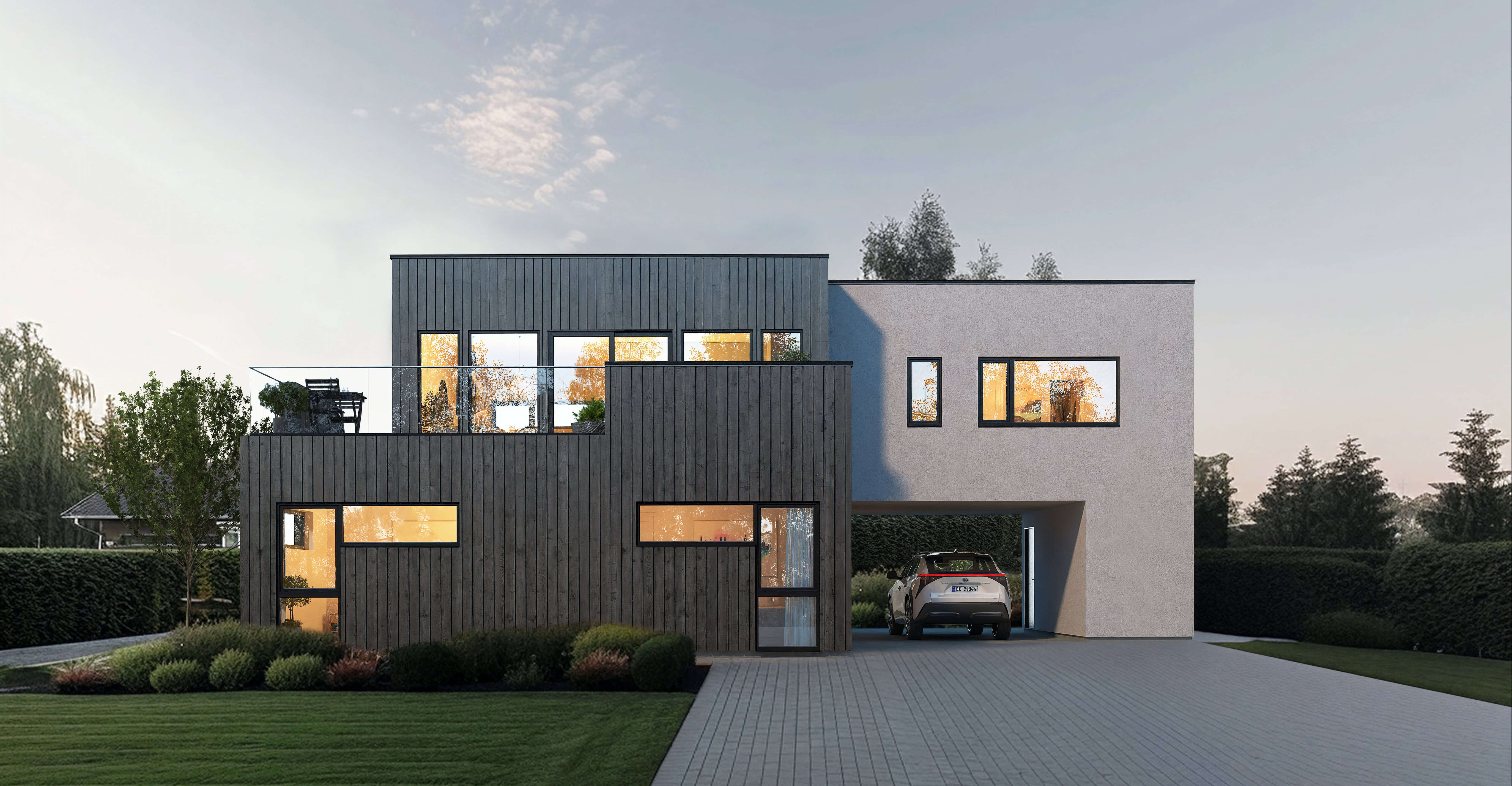 Slottsvik har et unikt design, med en kombinasjon av stående kledning og fasadeplater, og en karakteristisk bro over carporten. Her får du store vindusflater og gjennomtenkte detaljer, som gir boligen et eksklusivt og moderne preg.