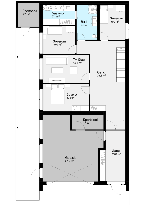 Med integrert garasje og sportsbod får du alt samlet – praktisk, oversiktlig og gjennomført.