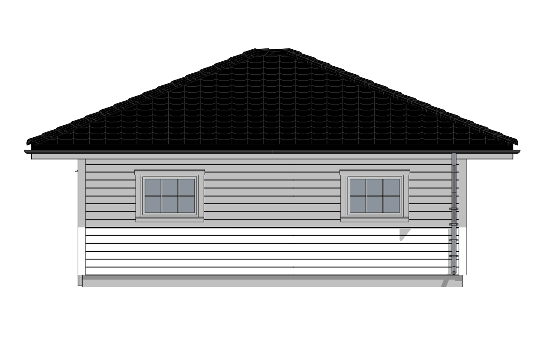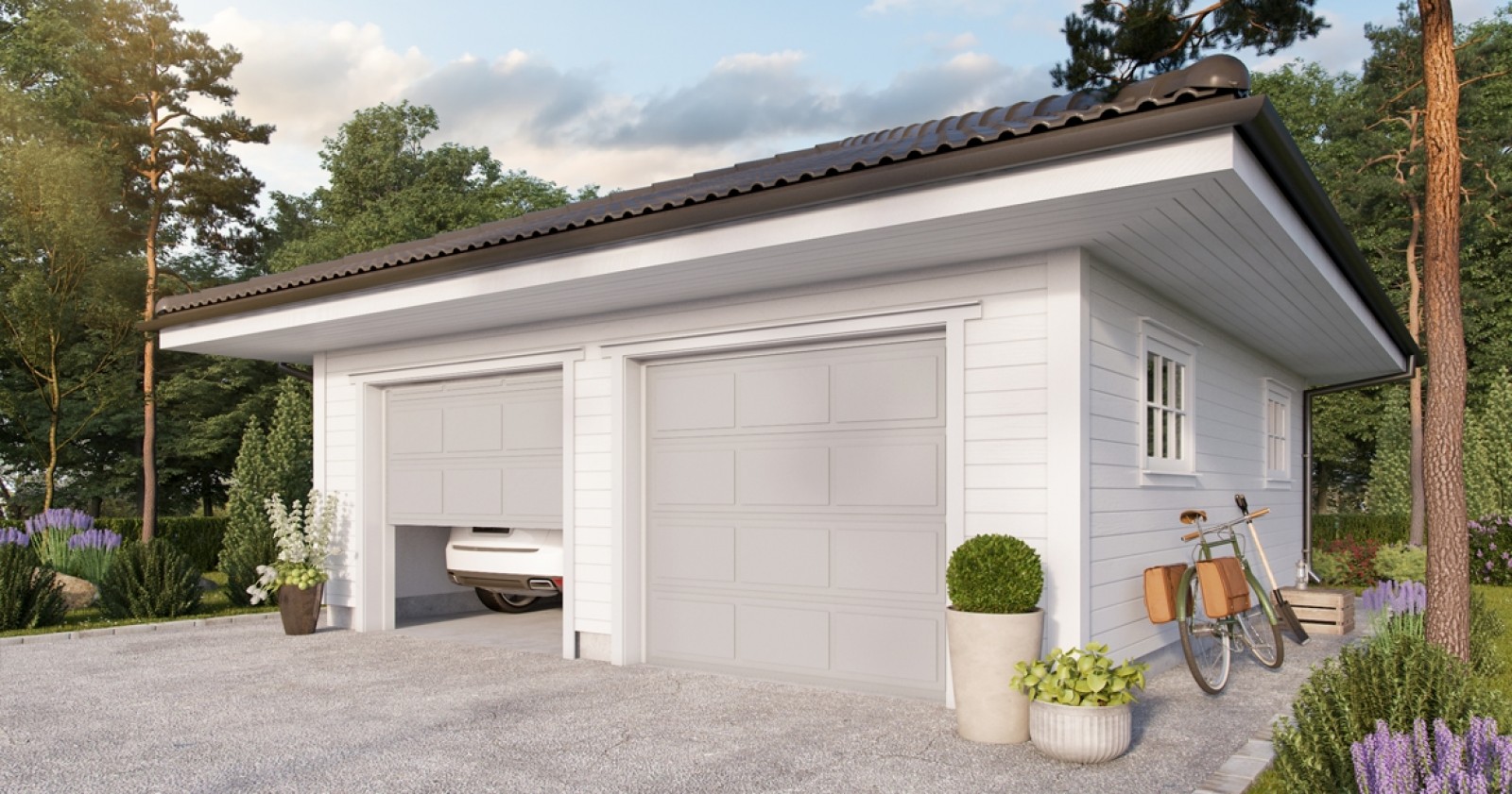 Med doble garasjeporter og valmet tak, er dette en garasje for deg som ønsker et bygg med herskapelig uttrykk ved boligen din. Med sine nesten 45m2 har denne garasjen både plass til to personbiler, og alt annet du måtte ønske å lagre i garasjen.