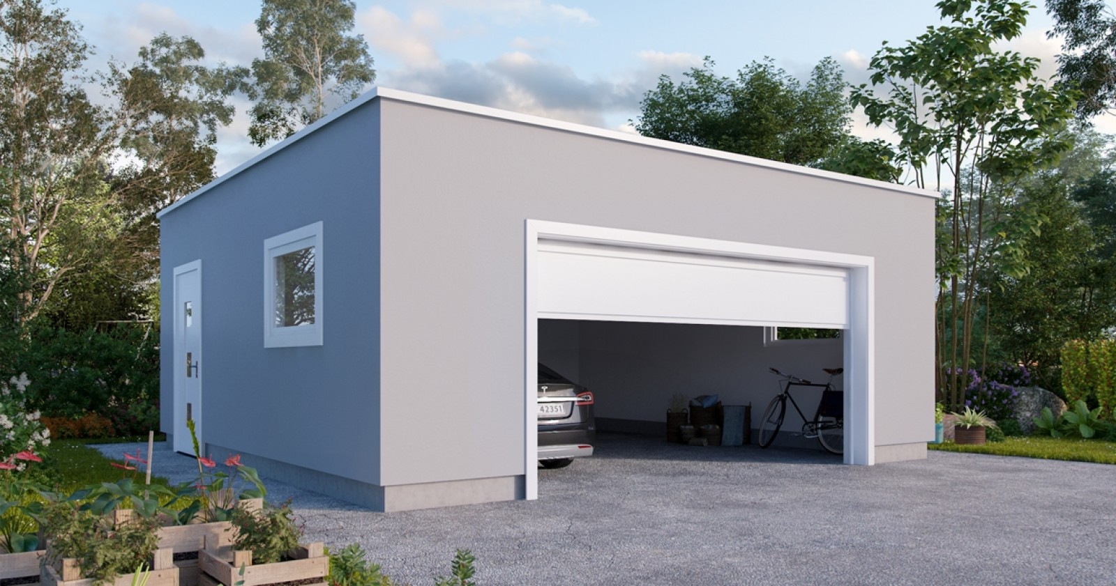 Garasje G806 er en tøff og enkel garasje i moderne utførelse. Det flate taket, den brede porten og pusset fasade fremhever funkis-preget og bygget vil stå svært godt til den moderne boligen din.